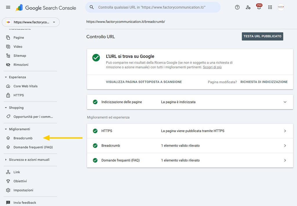 Below you will find the Breadcrumb section of Google Search Console related to this article and more specifically https://www.factorycommunication.it/breadcrumb/