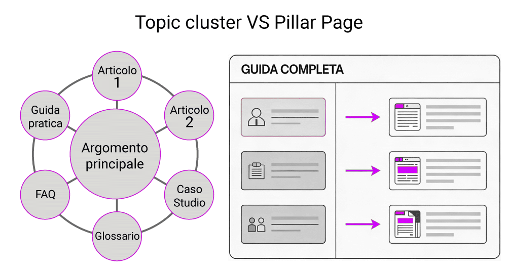The difference between topic cluster and pillar page SEO lies in the level at which they operate: the topic cluster is the strategic architecture, the pillar page is one of the (key) elements of this architecture.