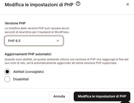 - Se gli errori sono tali da compromettere il funzionamento del sito, puoi procedere all’impostazione della versione PHP immediatamente precedente, esempio da 8.5 a 8.4, ed eventualmente procedere fino alla versione che non causa più problemi.