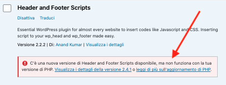L’aggiornamento di temi e plugin fallisce perché questi componenti, nelle ultime versioni, richiedono PHP 8.3 o superiori.