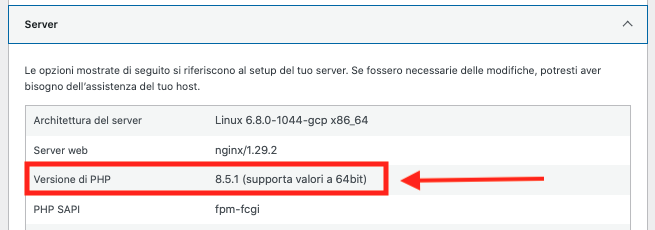 Alla voce “Impostazioni” > “Server” è indicata la versione PHP in uso.