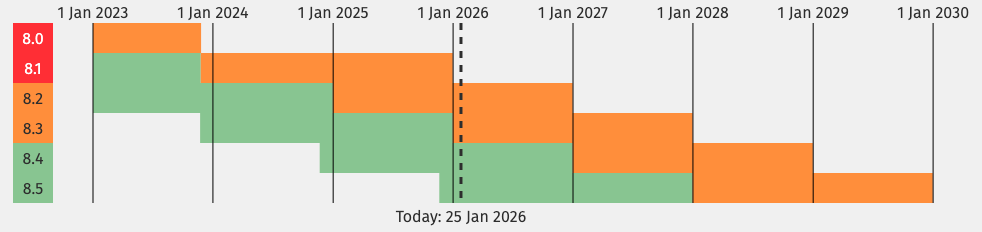 Ricevono solo aggiornamenti di sicurezza le versioni 8.2 (fino al 31-12-2026) e 8.3 (fino al 31-12-2027).